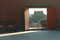 The Meridian Gate has two protruding wings forming three sides of a square (Wumen, or Meridian Gate, Square) before it.[38] The gate has five gateways. The central gateway is part of the Imperial Way, a stone flagged path that forms the central axis of the Forbidden City and the ancient city of Beijing itself, and leads all the way from the Gate of China in the south to Jingshan in the north. Only the Emperor may walk or ride on the Imperial Way, except for the Empress on the occasion of her wedding, and successful students after the Imperial Examination.[37]